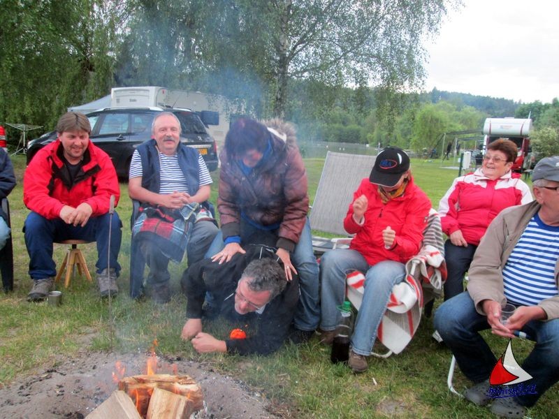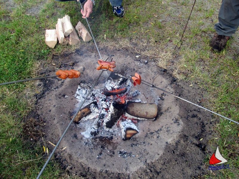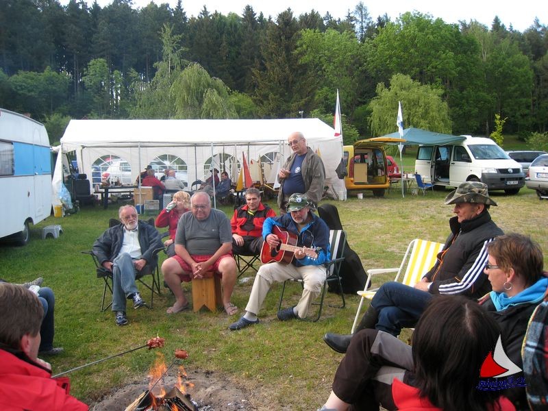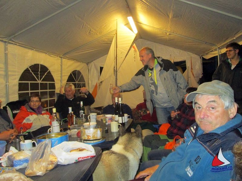 Večer náš osvědčený odborník na oheň opět roztopil ohniště a opékaly se buřty. Každý si svůj kousek upravil a opekl ke své chuti. Mnozí stateční opékali i za deště. O chvíli později déšť zesílil a přidal se velký vítr a tak se všichni namačkali pod veliký stan. To se ukázalo později jako nezbytně nutné pro jeho záchranu, když přišly docela silné poryvy větru. Každý kdo mohl, stan držel, až to ve stanu vypadalo jako v MHD. Obětavci Miloš s Hankou se pokusili zachránit malý stan pro rozhodčí u vody. Nakonec ho rozložili na díly. Ostatní klubové stany u Fkařů takové štěstí neměly – ty rozložil vítr. Počasí se ale nakonec zase umoudřilo a tak si většina posedala kolem ohniště, Pepa vytáhl kytaru a byla pohoda.